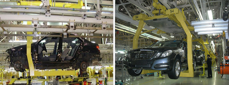 This project integrates equipment in the existing Chrysler automobile assembly shop in Beijing Benz, producing Mercedes-Benz E-Class and C-Class. A new ASD conveyor line is installed at the ground level. Use a roller raft lift to lower the body to the ground level. The air slide is fed into the roller bed and, at 0 m, is transported by a chain conveyor to the new ASD conveyor line on the north side. The body is then fed into a +3.3 m C-type spreader by means of a travel machine, a roller bed and a lift. The body is on the final assembly slide. After the operation is completed, the body enters the traverse protection station (speed 12min/min) to the left or right. In order to adapt to the automatic conversion of the two models. The fulcrum automatic conversion device is installed online and converted according to different models. On the chassis spreader and the skid body, the body is turned to the work station, and the lifting platform and the floating device are arranged, and the positioning device is accurately positioned to ensure the accuracy of the hanging. In order to adapt to the new model, the door line has been retrofitted to all support and installation structures to ensure that the door line adapts to the needs of the new model.