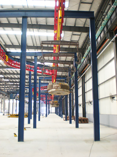 重型積放式懸掛輸送機是我公司定型優質產品。其系統主要由驅動裝置、張緊裝置、軌道系統、牽引鏈條、承載車組及載荷梁等組成。該輸送系統已在工程機械、冶金等行業得到成功應用,獲得用戶一致好評。
