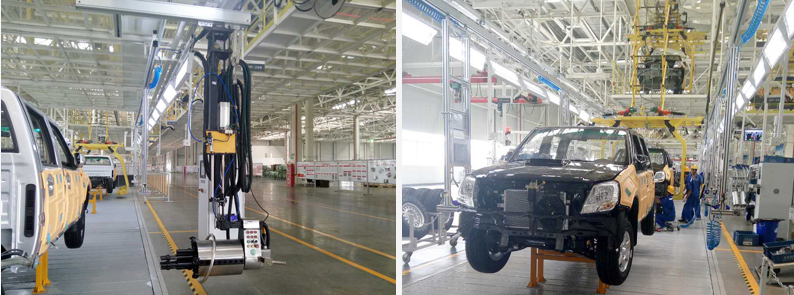 北汽福田汽車股份有限公司在異地擴建皮卡和SUV生產線(佛山),為總裝車間技術改造項目。本項目為我公司總承包項目,包括內飾線、底盤線、綜合線、工藝吊架及照明、貨箱分裝臺,儀表分裝臺、后橋分裝臺、尾氣抽排室、KPK、行車、工藝二次管線、全車供電系統、全系統集成。同時,包括現場管理、項目協調等管理工作。主要參數:產品:薩普、P201、U201。標準年工作時基250天,雙班工作制,每班8h,生產綱領80000輛/年